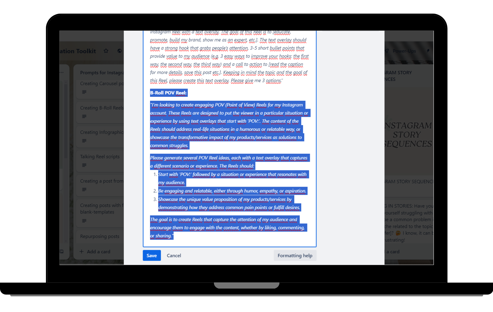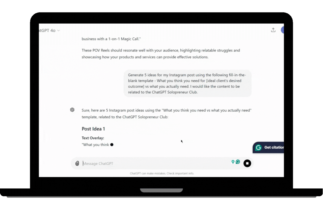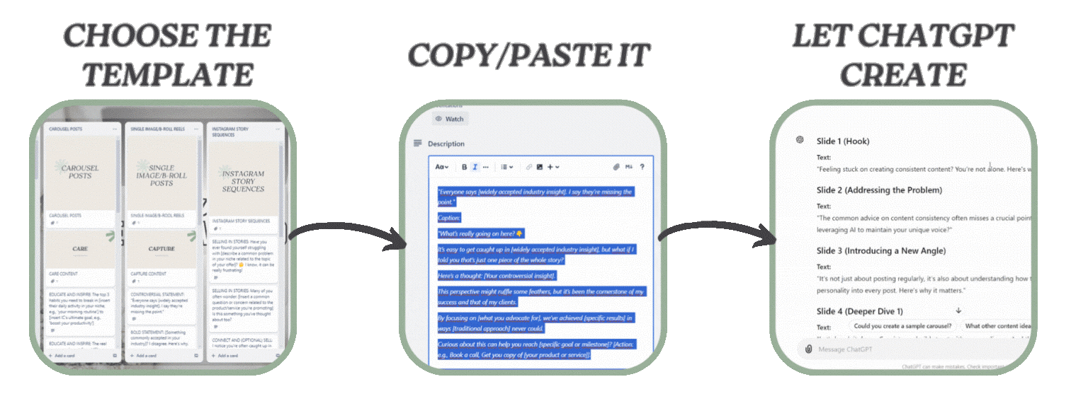 Over 130 content templates, including templates for carousel posts, captions, B-Roll Reels text overlay, Instagram Stories sequences along with templates for attention-grabbing hooks... that you use with ChatGPT for super quick content creation, so you can create engaging posts in minutes, not hours, freeing up your schedule.
