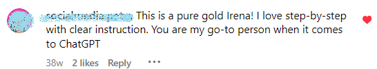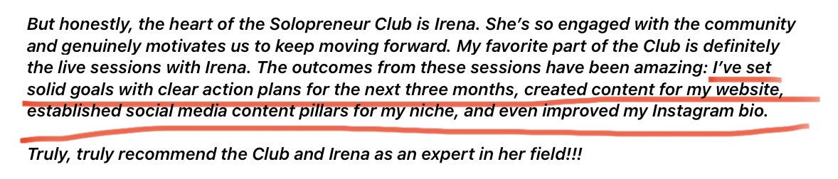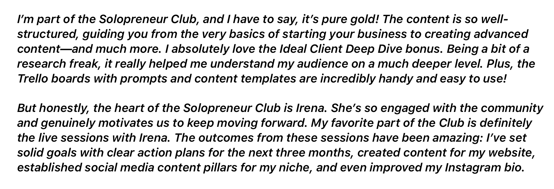 "The ChatGPT Solopreneur Club has been SO helpful to me with my business! Irena is not only extremely knowledgeable on all things ChatGPT, she is also super friendly and so easy to work with. The membership had provided so many useful tools and prompts to enable me to fully integrate ChatGPT into my business. It's not just about using it for social media prompts, it's opened my eyes to all the ways it can help with business support. I would highly recommend Irena and the membership to anyone looking to improve their processes and time management!"