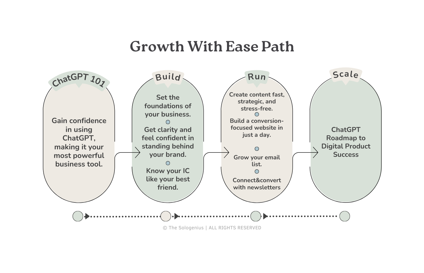 The ChatGPT Solopreneur Club is organized into four main "modules," guiding you step-by-step through the process of building, running, and scaling your business.