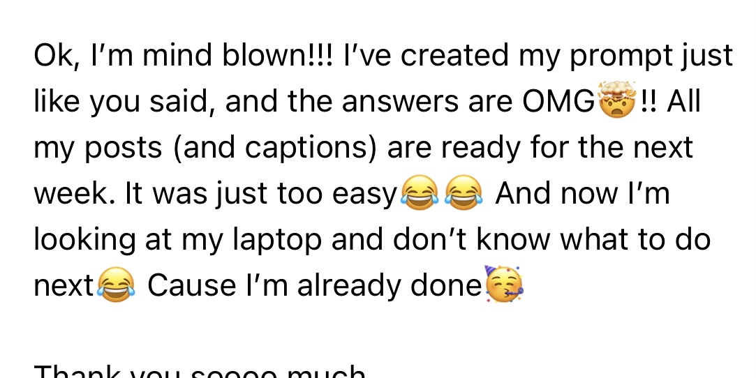 My goal? Simply put, I'm here to help you strategically grow your biz using this time-saving lifesaver, ChatGPT. With it, I've created foolproof content creation systems that make posting on Instagram a breeze and effective... without the anxiety that typically comes with daily posting!