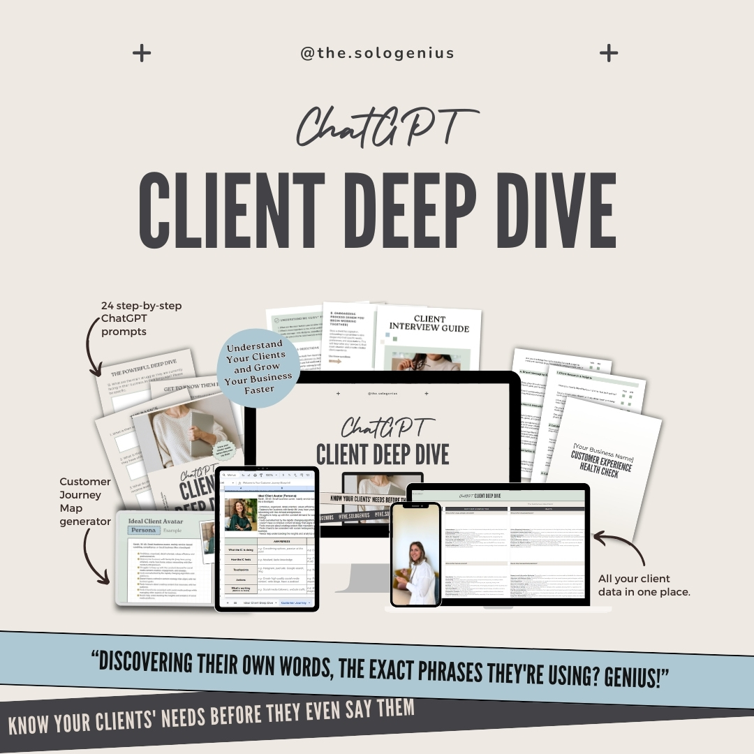 ChatGPT Client Deep Dive is a done-for-you system that will help you understand your ideal client deeply, create content that resonates, and offers that sell - without second-guessing.