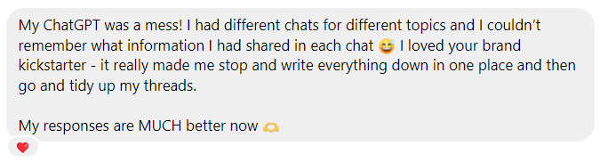 "The ChatGPT Solopreneur Club has been SO helpful to me with my business! Irena is not only extremely knowledgeable on all things ChatGPT, she is also super friendly and so easy to work with. The membership had provided so many useful tools and prompts to enable me to fully integrate ChatGPT into my business. It's not just about using it for social media prompts, it's opened my eyes to all the ways it can help with business support. I would highly recommend Irena and the membership to anyone looking to improve their processes and time management!"