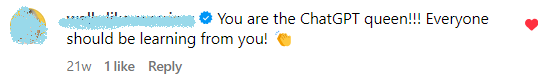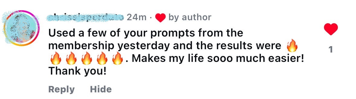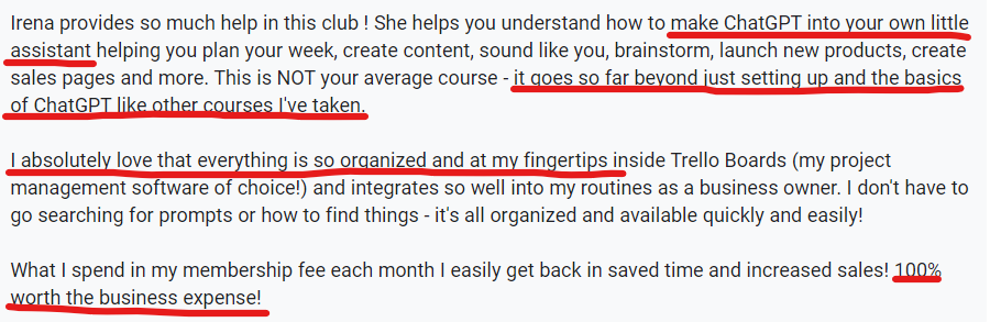 "Irena provides so much help in this club ! She helps you understand how to make ChatGPT into your own little assistant helping you plan your week, create content, sound like you, brainstorm, launch new products, create sales pages and more. This is NOT your average course - it goes so far beyond just setting up and the basics of ChatGPT like other courses I've taken.